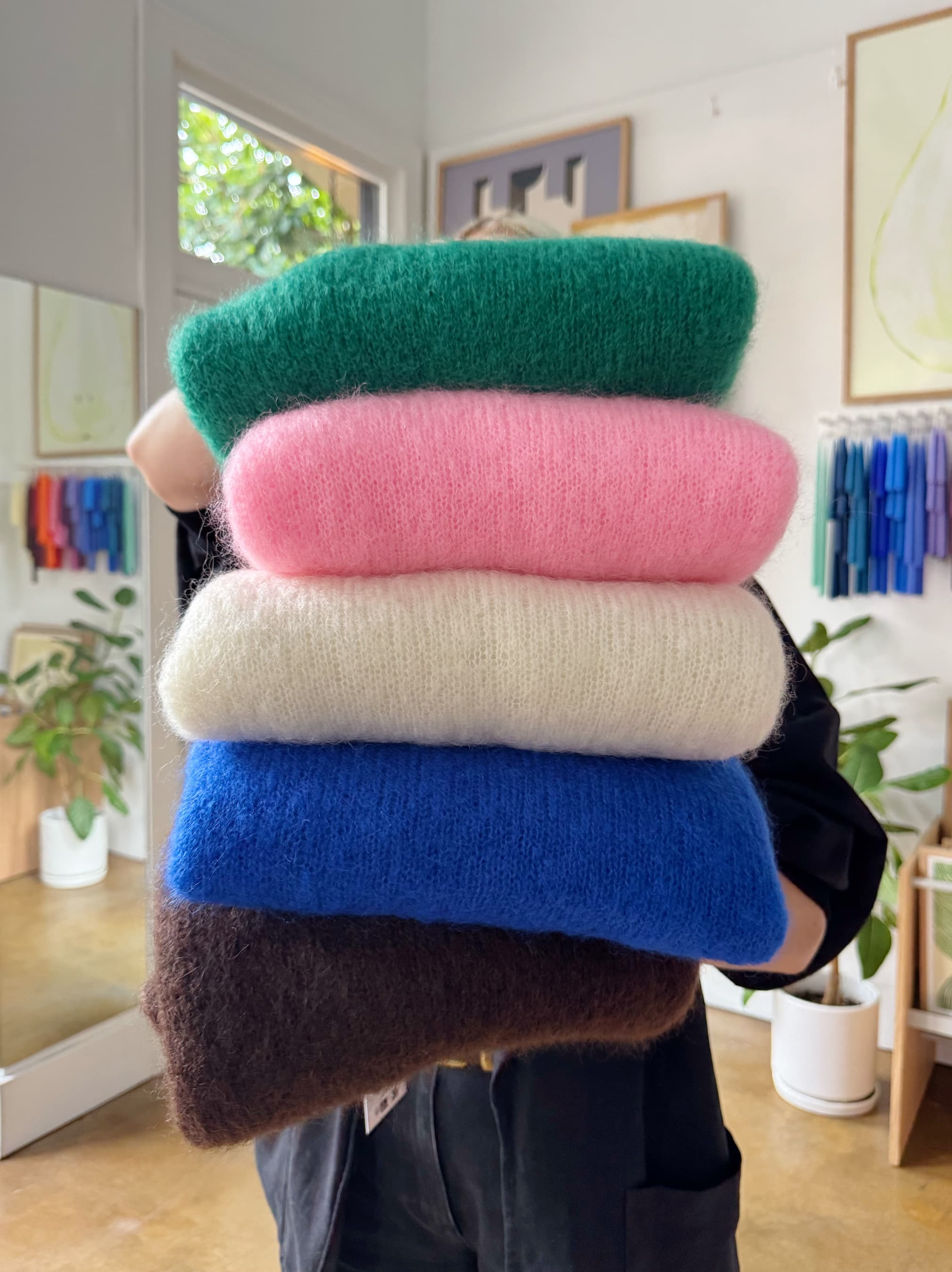 Two years ago, while wandering through Paris, we stumbled upon a little pop-up full of colorful sweaters (see pics below!). We fell in love instantly - and now, after MUCH anticipation, they’ve finally made their way to our Portland shop.