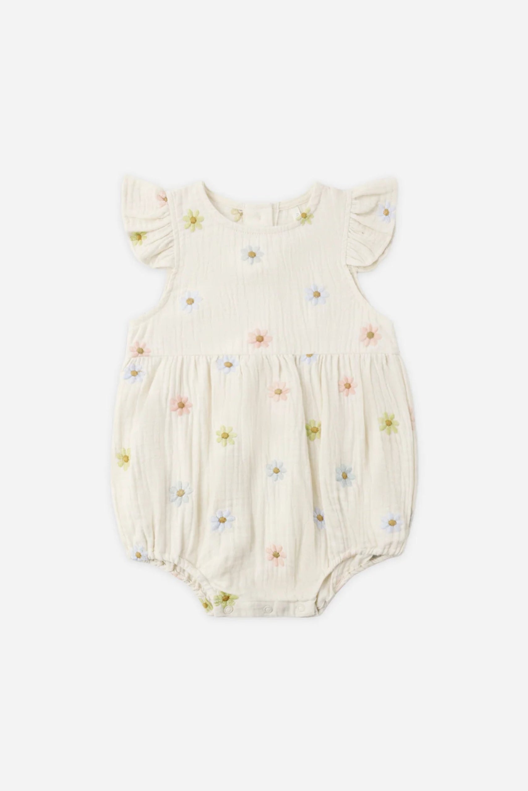 This woven one-piece romper features ruffle flutter details at the arm openings, a loose bubble shape with coconut buttons at the back, and snaps at the bottom opening for easy changing.