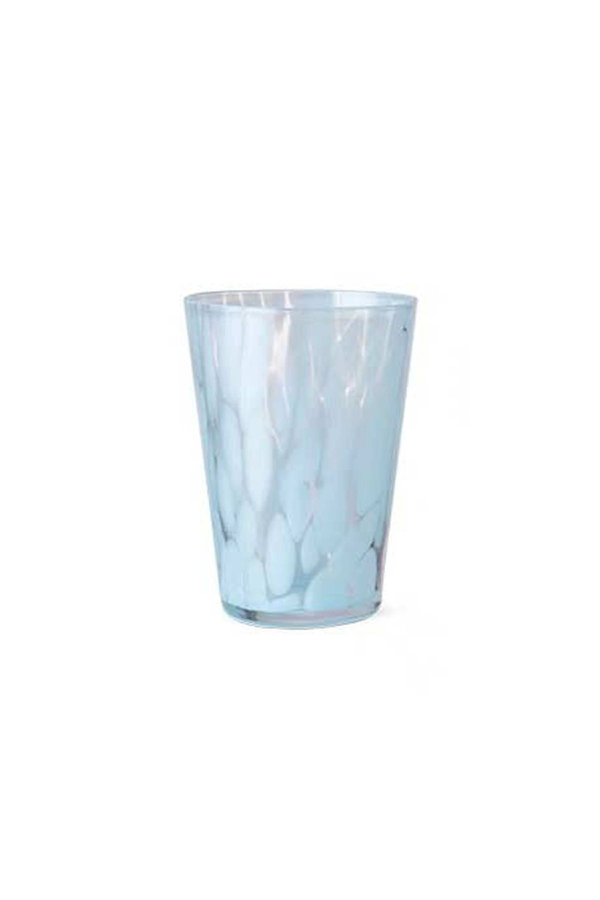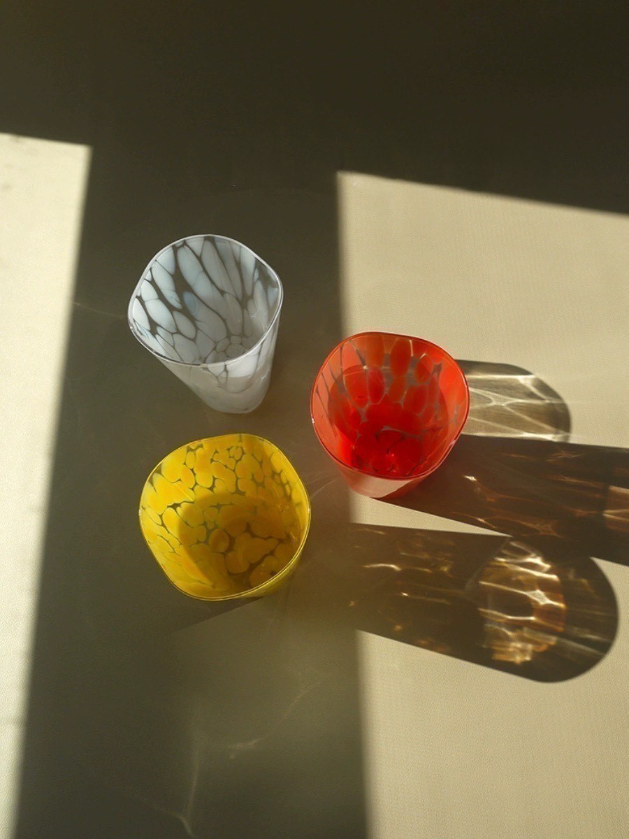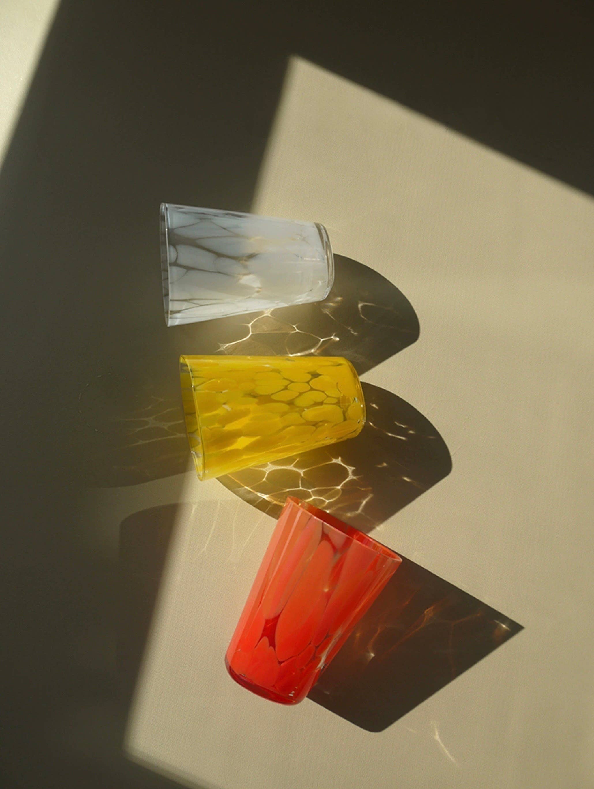 Mouth blown by skilled artisans, this colored glass tumbler has an asymmetrical, organic shape that sits comfortably in your hand, and the irregular pattern of monochrome spots is unique to each individual glass and will add a playful & refreshing touch to your table.