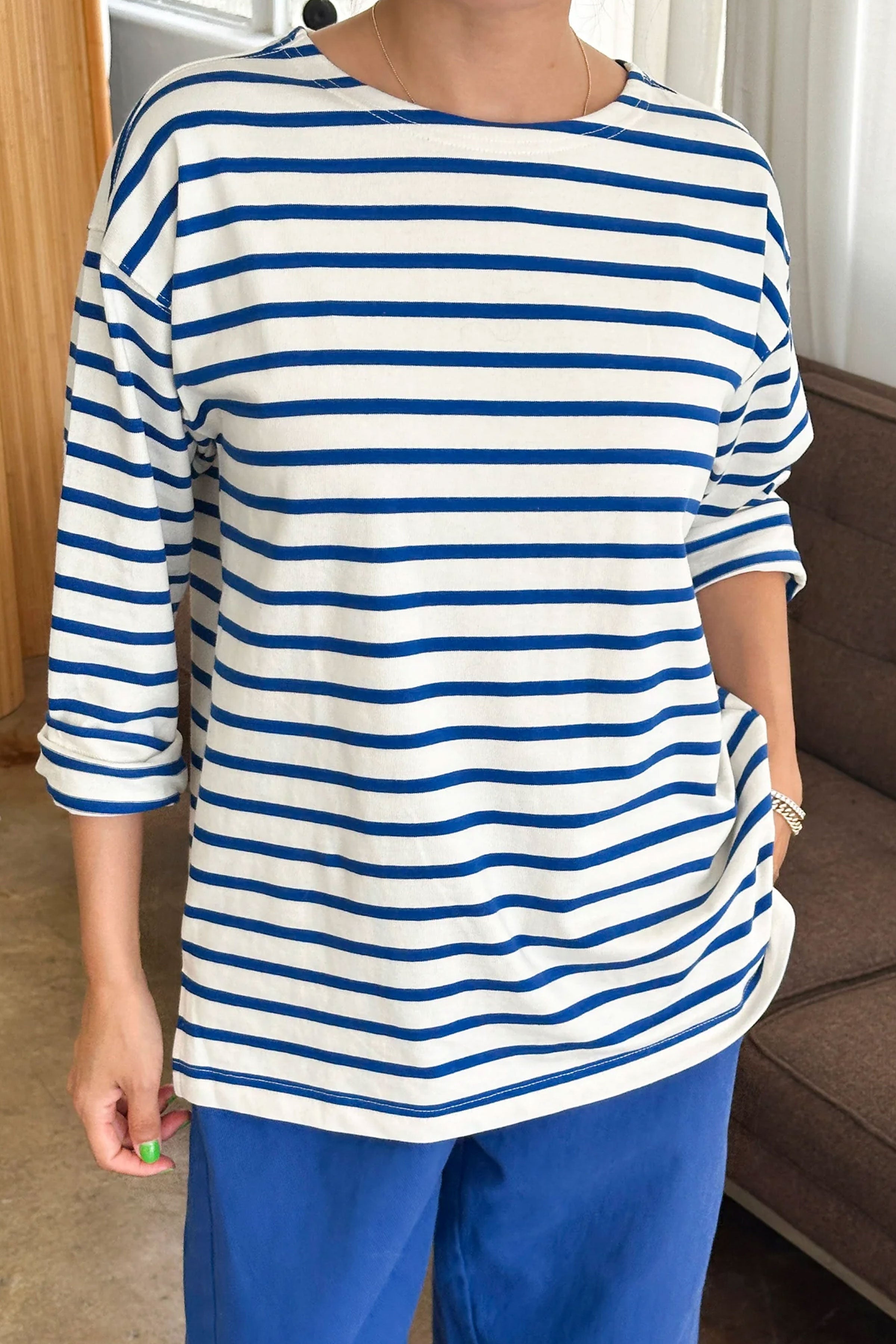 Add a touch of Parisian flair to your wardrobe. The Marseille Top takes inspiration from the timeless Breton stripe uniform, featuring a classic round neckline and an oversized, full-length fit that gently sweeps the hips. Crafted from durable, heavyweight cotton, it offers structure without sacrificing softness, making it an ideal choice for both elevated and casual looks.