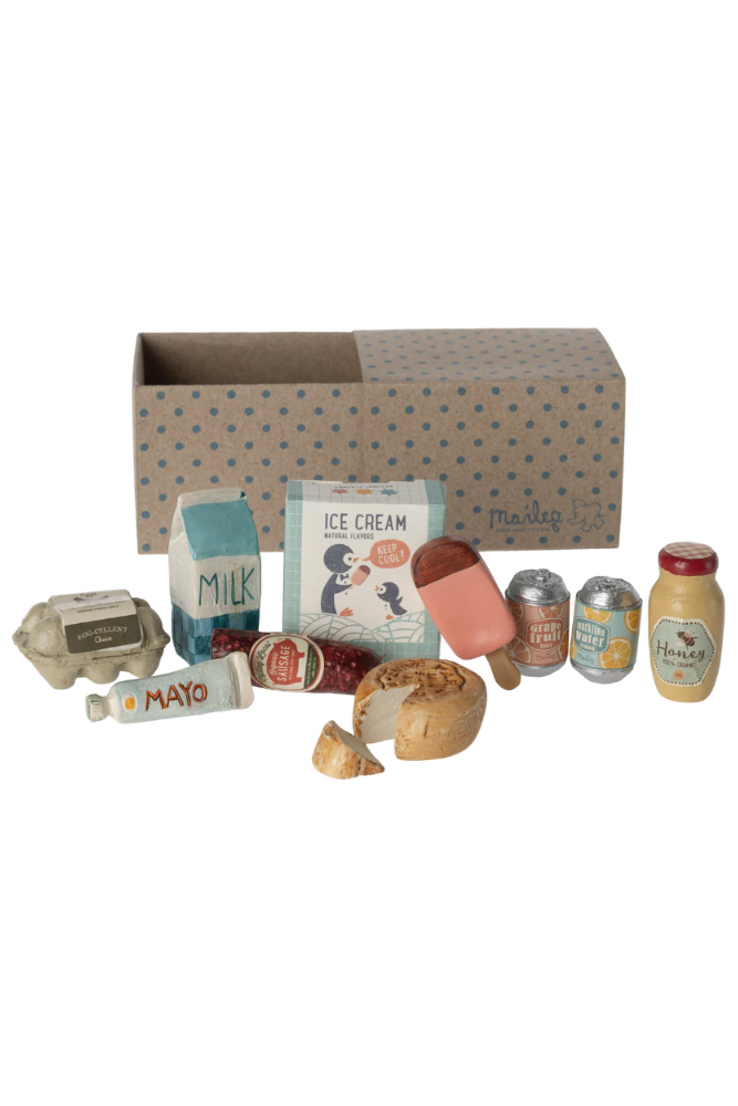 All the food your Maileg friend needs. This selection of food includes mayo, milk, honey jar, sausage, 4 ice cream sticks, egg cartons, 2 soda cans and cheese. It comes in a cardboard box. Small variations may occur in the painting.