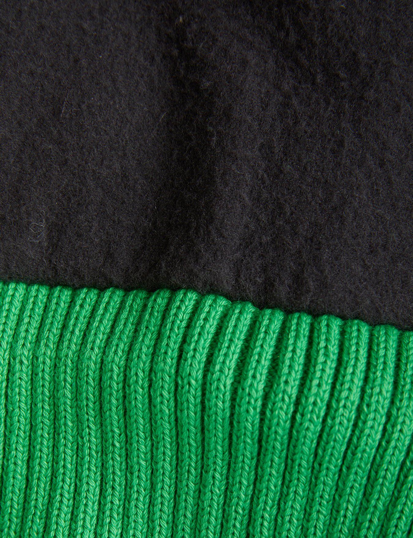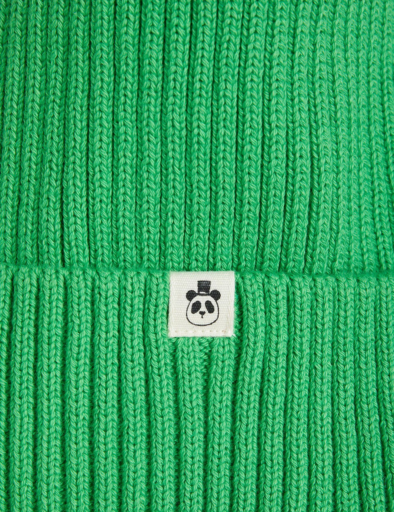 Green fleece lined knit beanie made from 100% organic cotton featuring a pom-pom on the top and a folded Mini Rodini Panda label on the brim. Sizes 44/46 and 48/50 has a strap attached to tie under the chin.