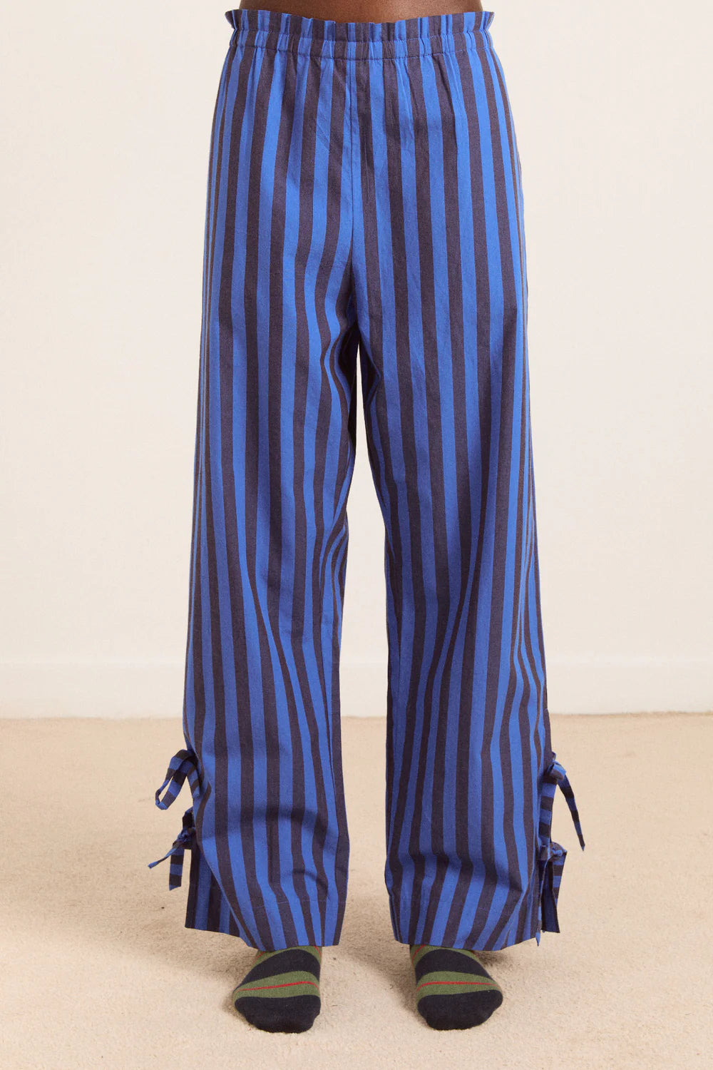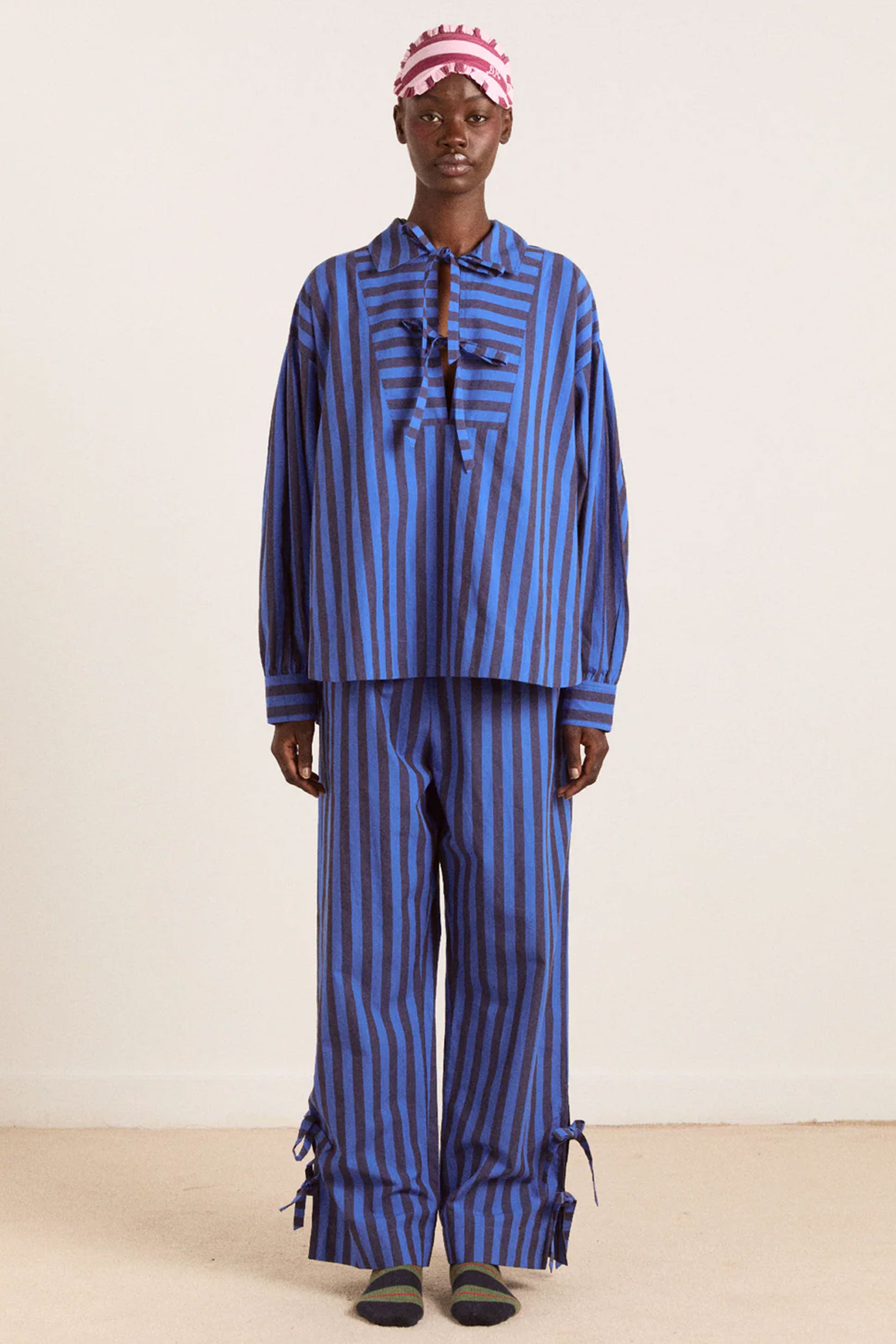 Meet the set of the season, the Floki PJ set. Featuring an all over blue stripe design, tie up blouse & leg detailing. Complete with fabric storage bag.
