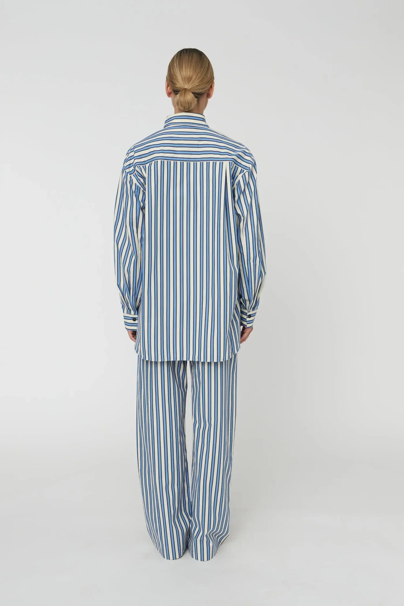 Striped oversized shirt with a classic collar, long sleeves with a cuff and a front button closure.