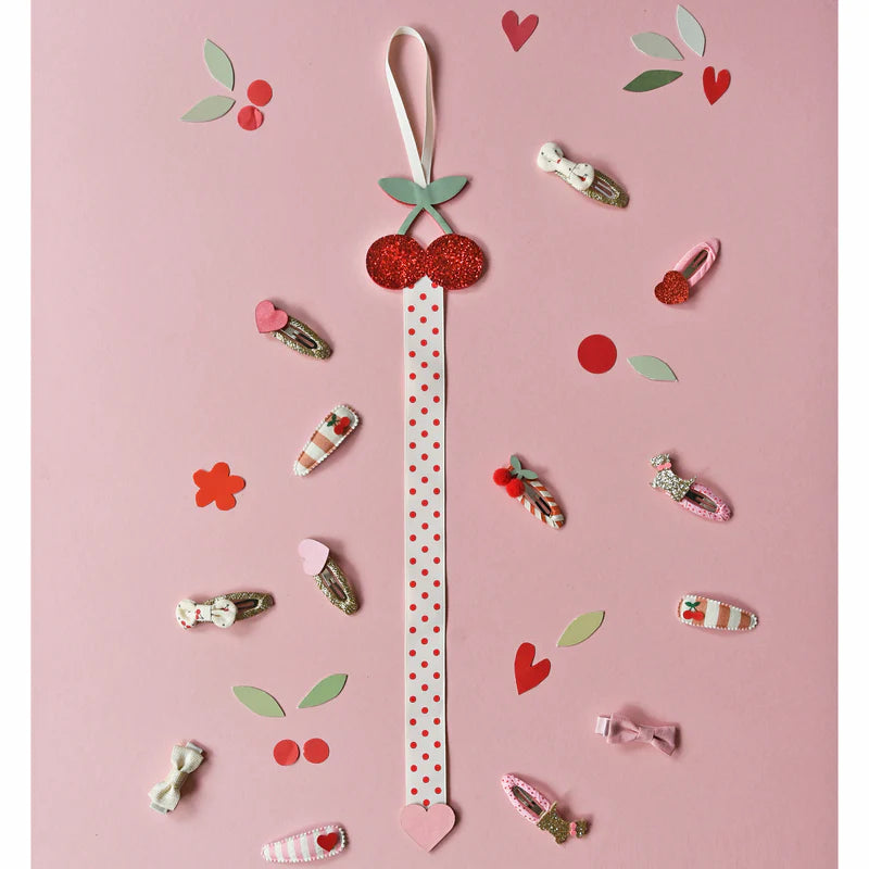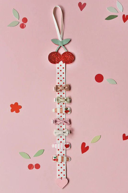 Our very cherry clip hanger can fit around 12 clips (depending on clip size) and hangs perfectly on a grosgrain ribbon!