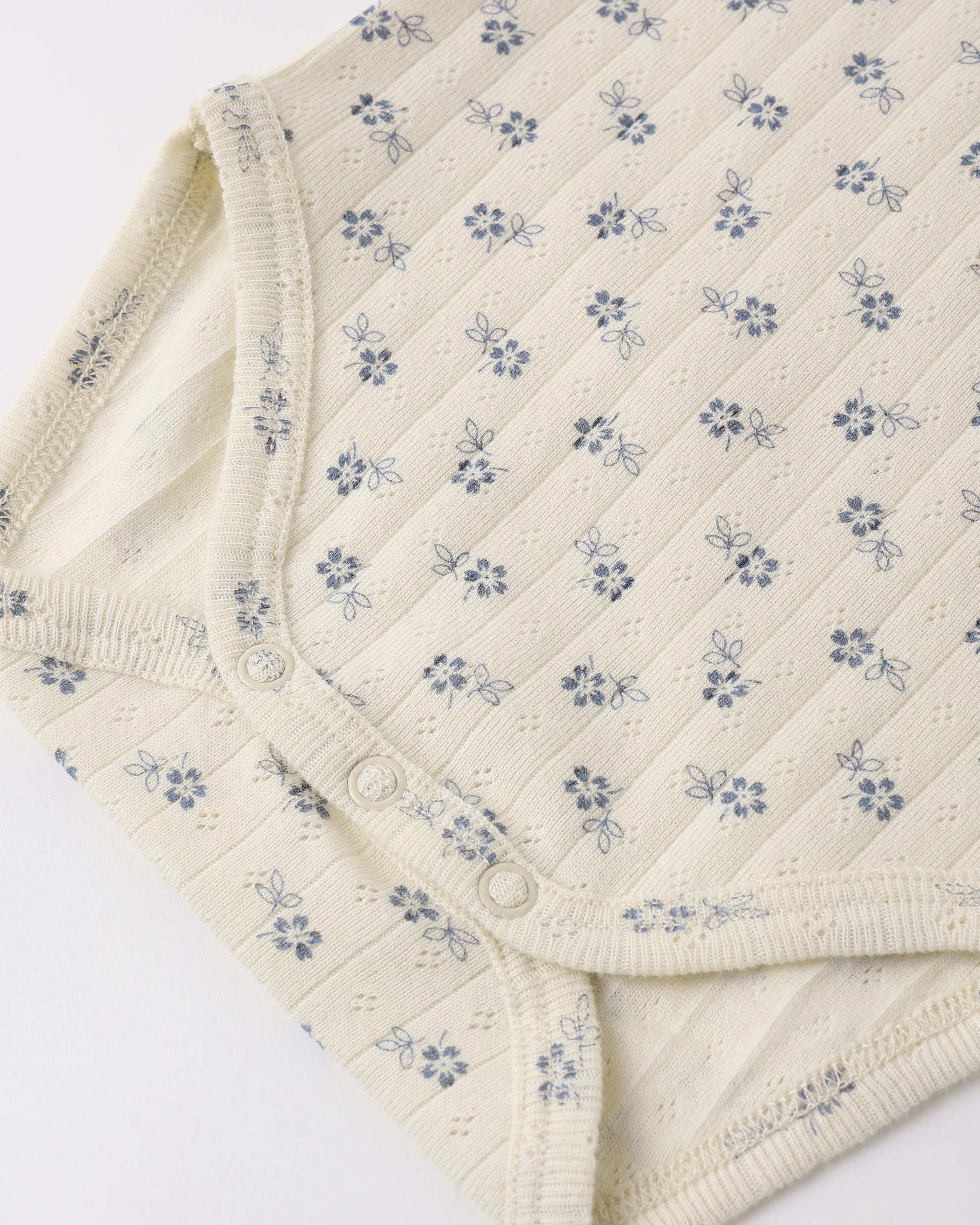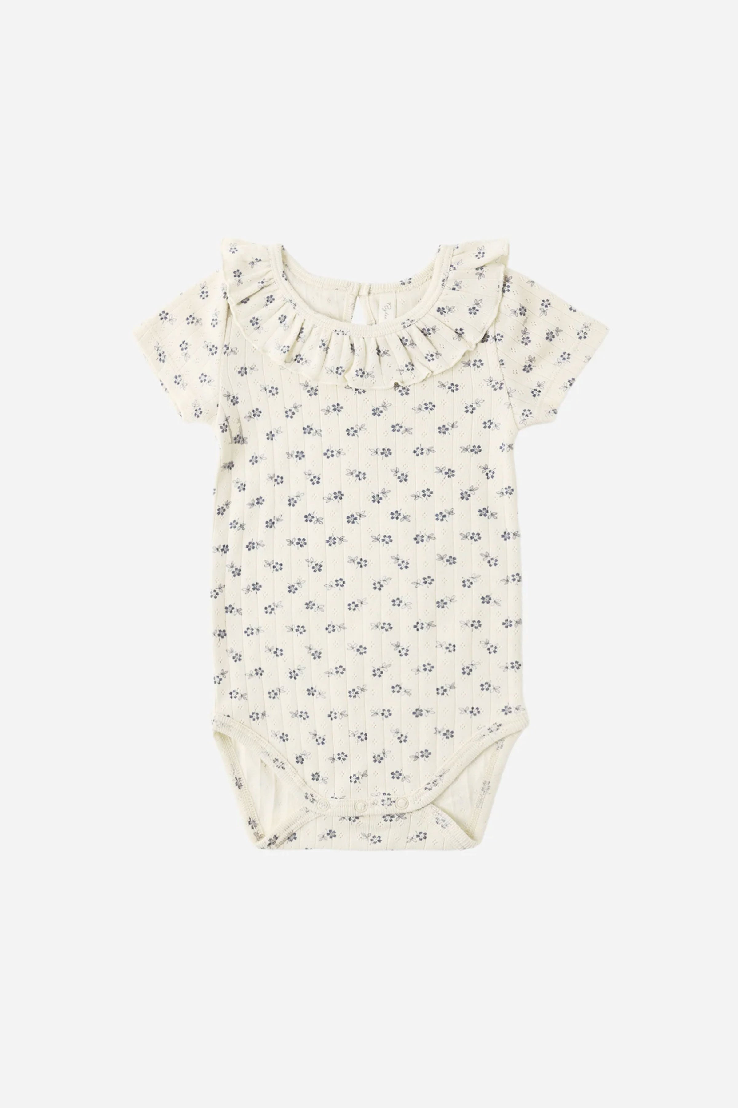 Short sleeve onesie, with a cute ruffled collar. All sizes have snaps at the inseam for easy changing.