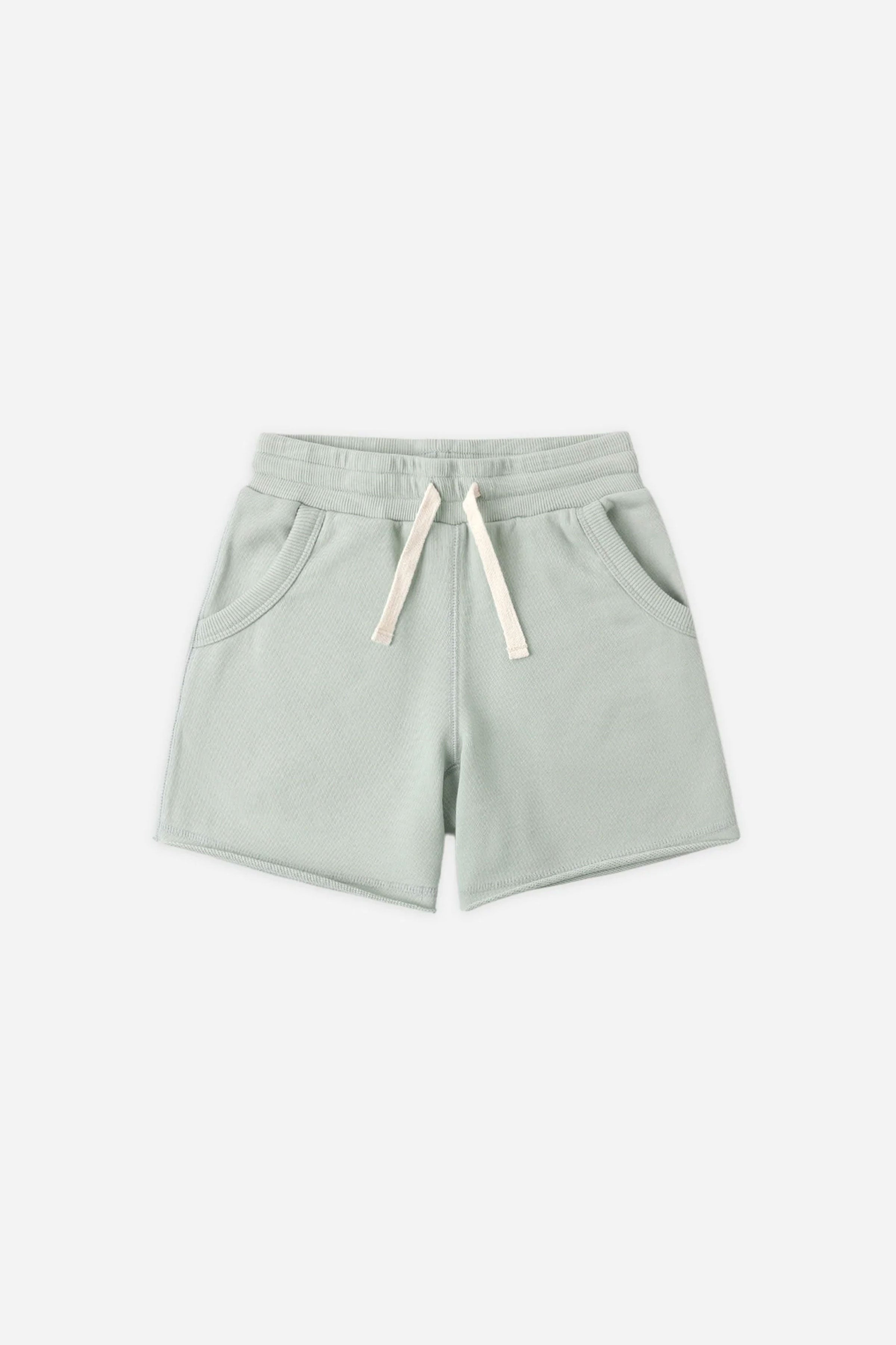 An everyday short featuring a classic elastic waistband, durable drawstrings, side pockets, and a raw edge.