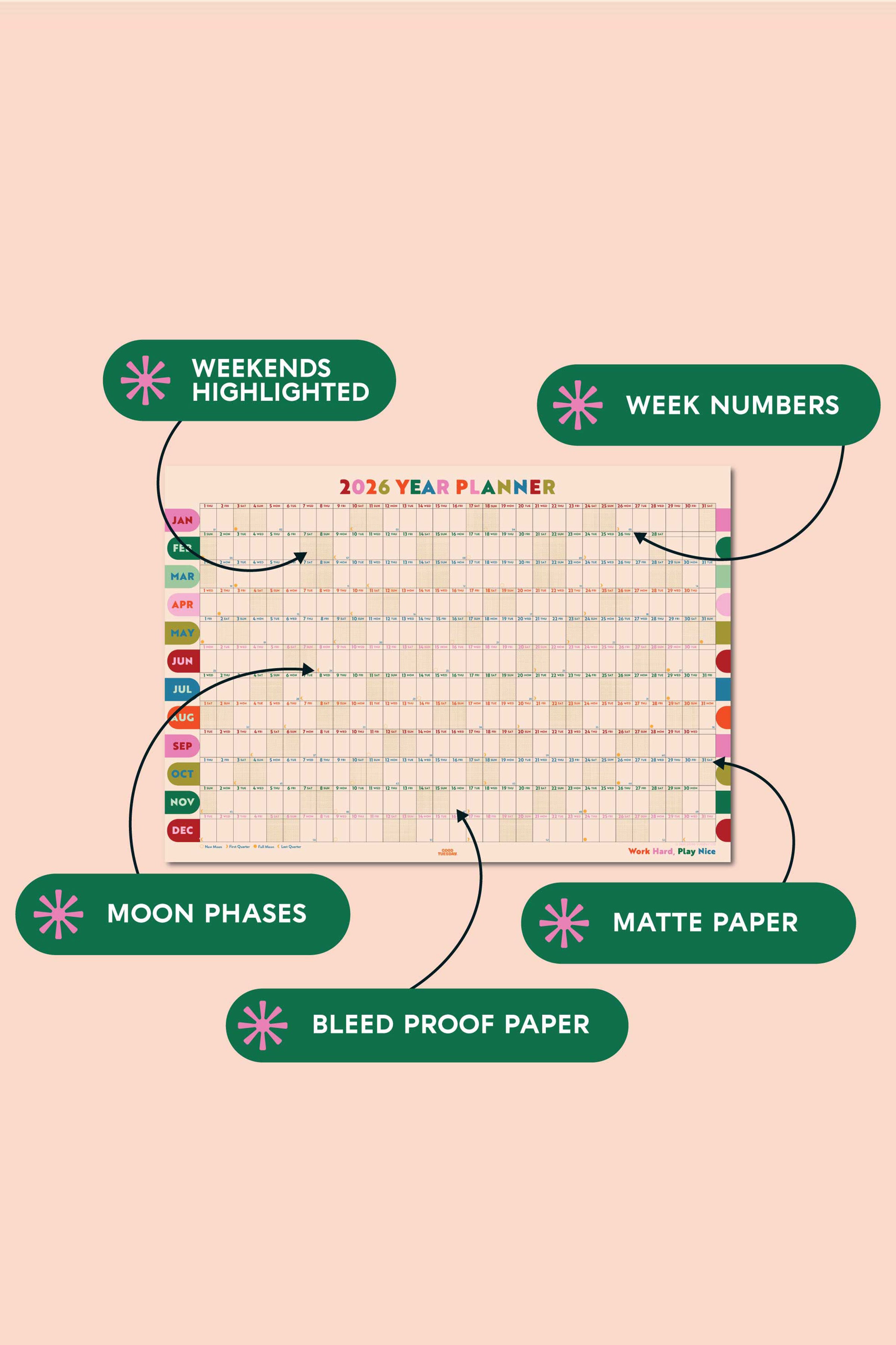 This landscape-format calendar runs from January to December 2026 and features a clean grid layout with moon phases and weekend highlights. The bold Play Nice Arches design adds energy and style to everyday planning—ideal for home offices, classrooms, or shared spaces.