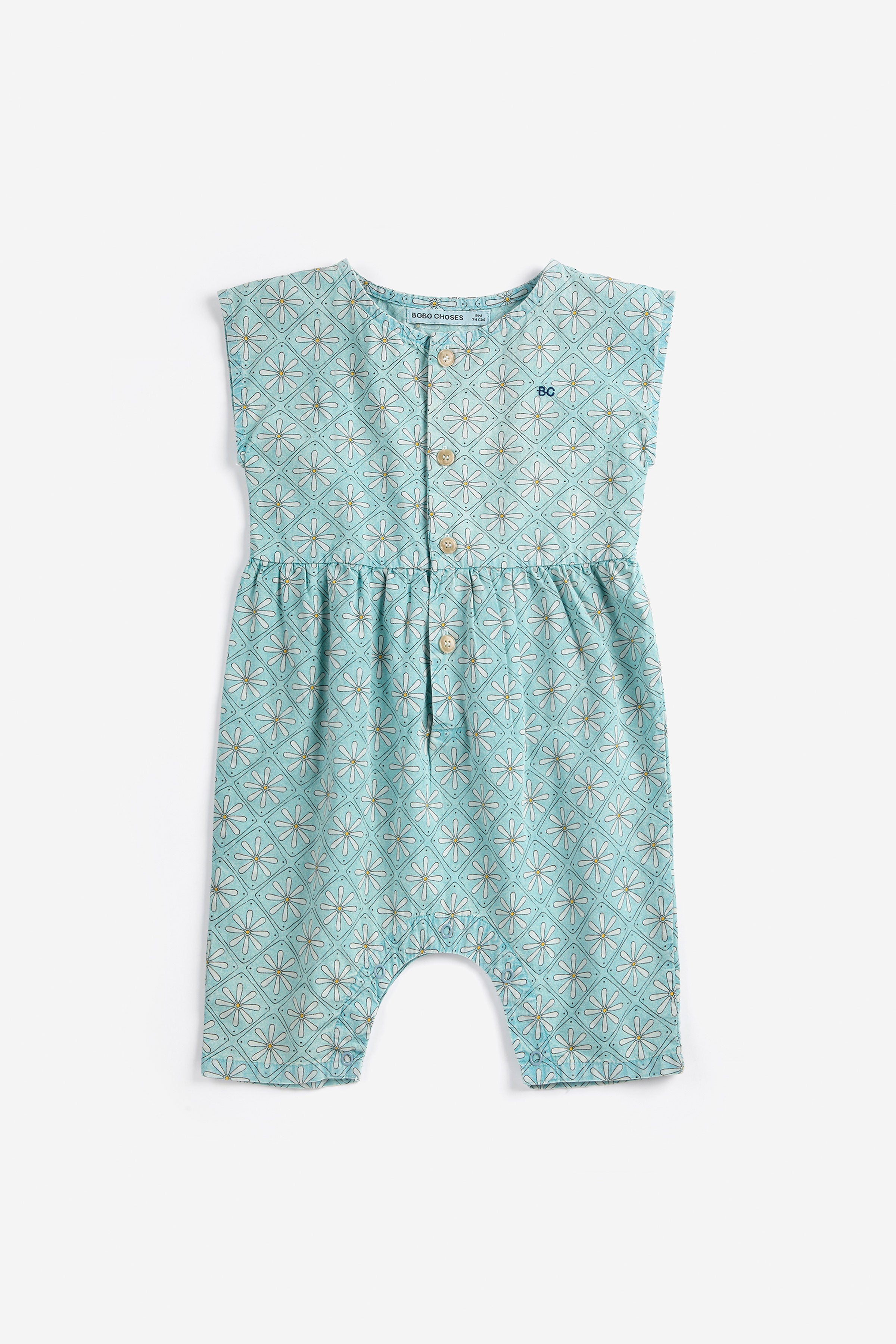 Designed with sleeveless, crotch snap fastening, baggy fit, front button fastening, and round neck.