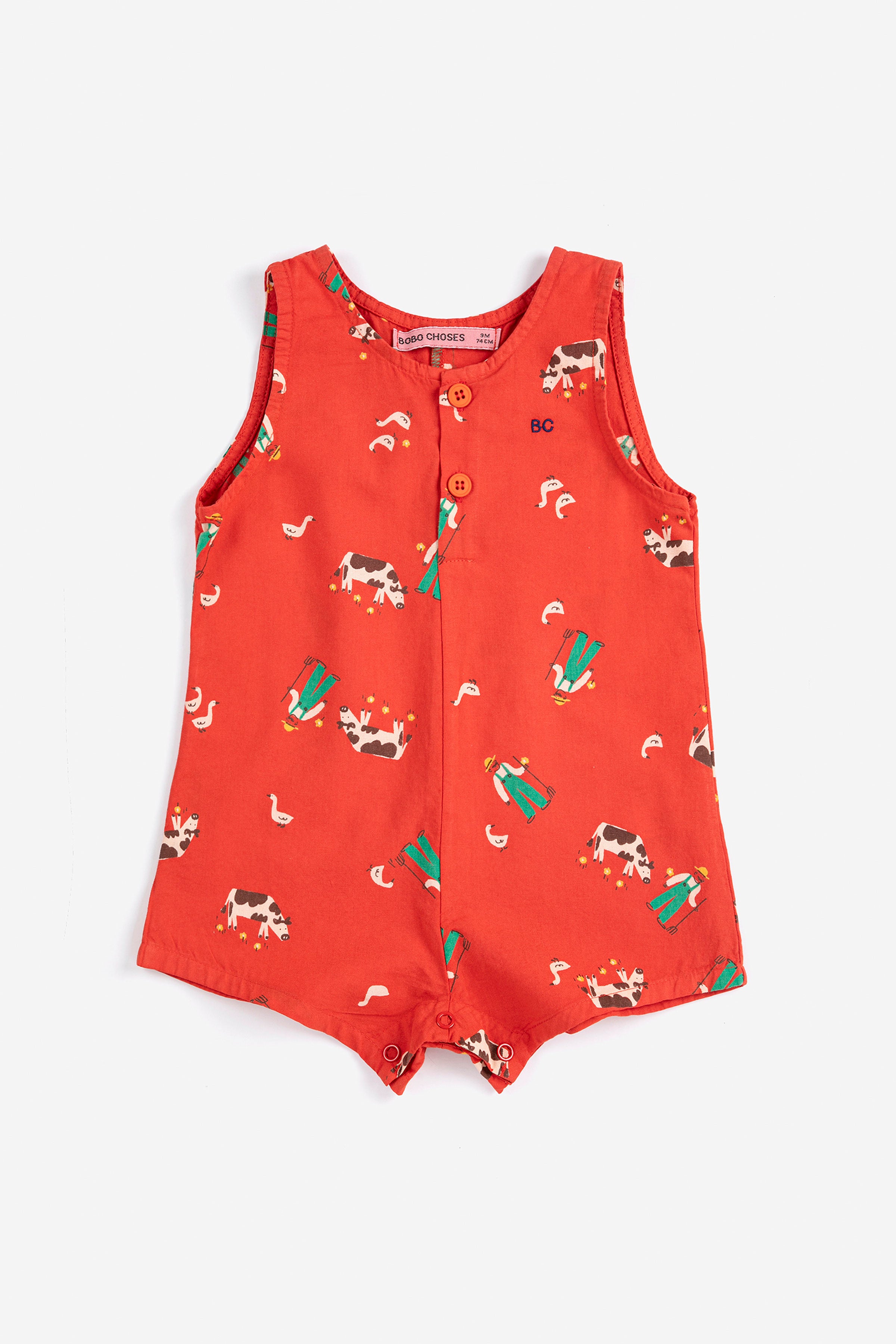 Fresh and versatile, this red playsuit is ideal for warm days. Designed with sleeveless, front button fastening, crotch snap fastening, embroidery, loose fit, over knee length, round neck and half placket.