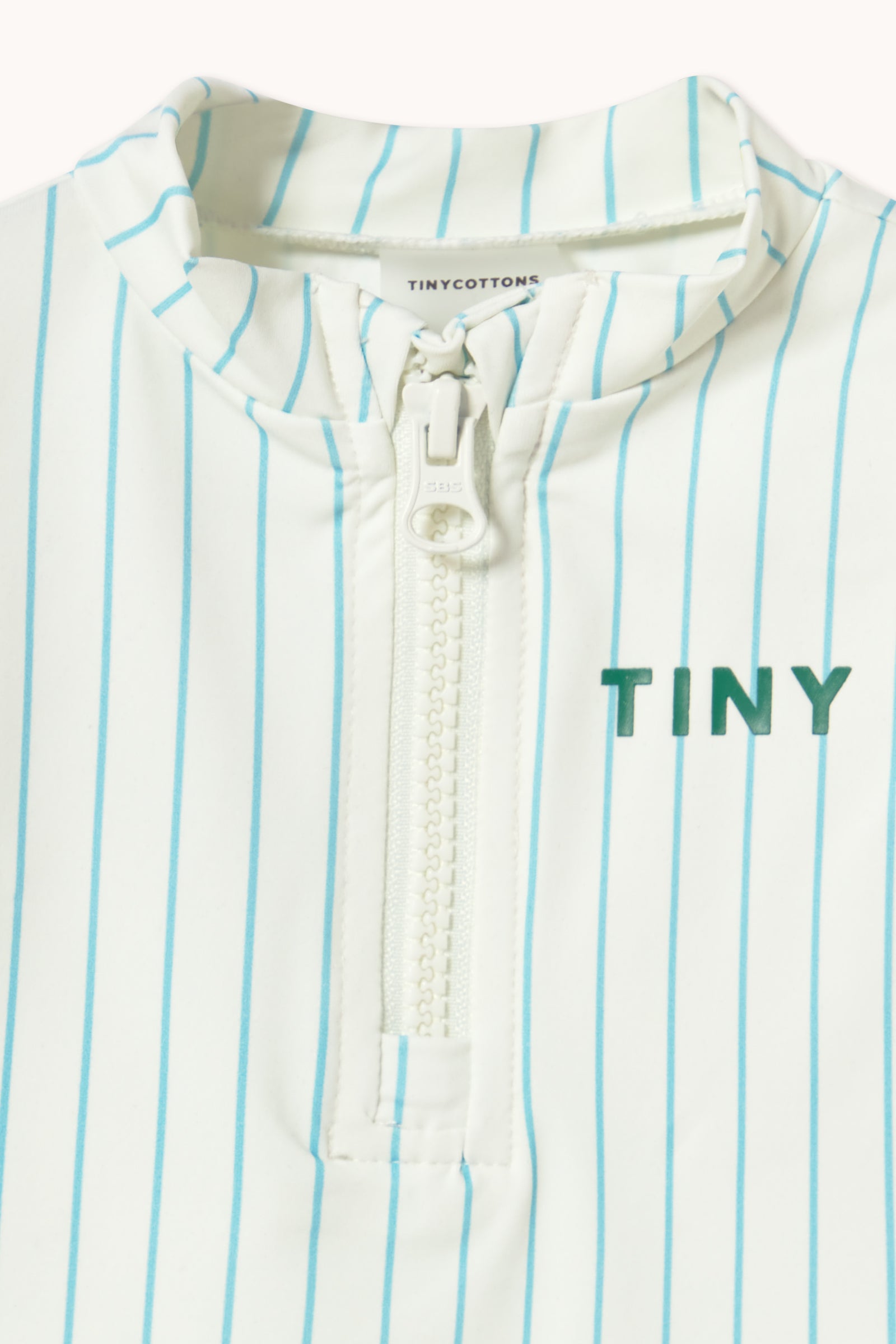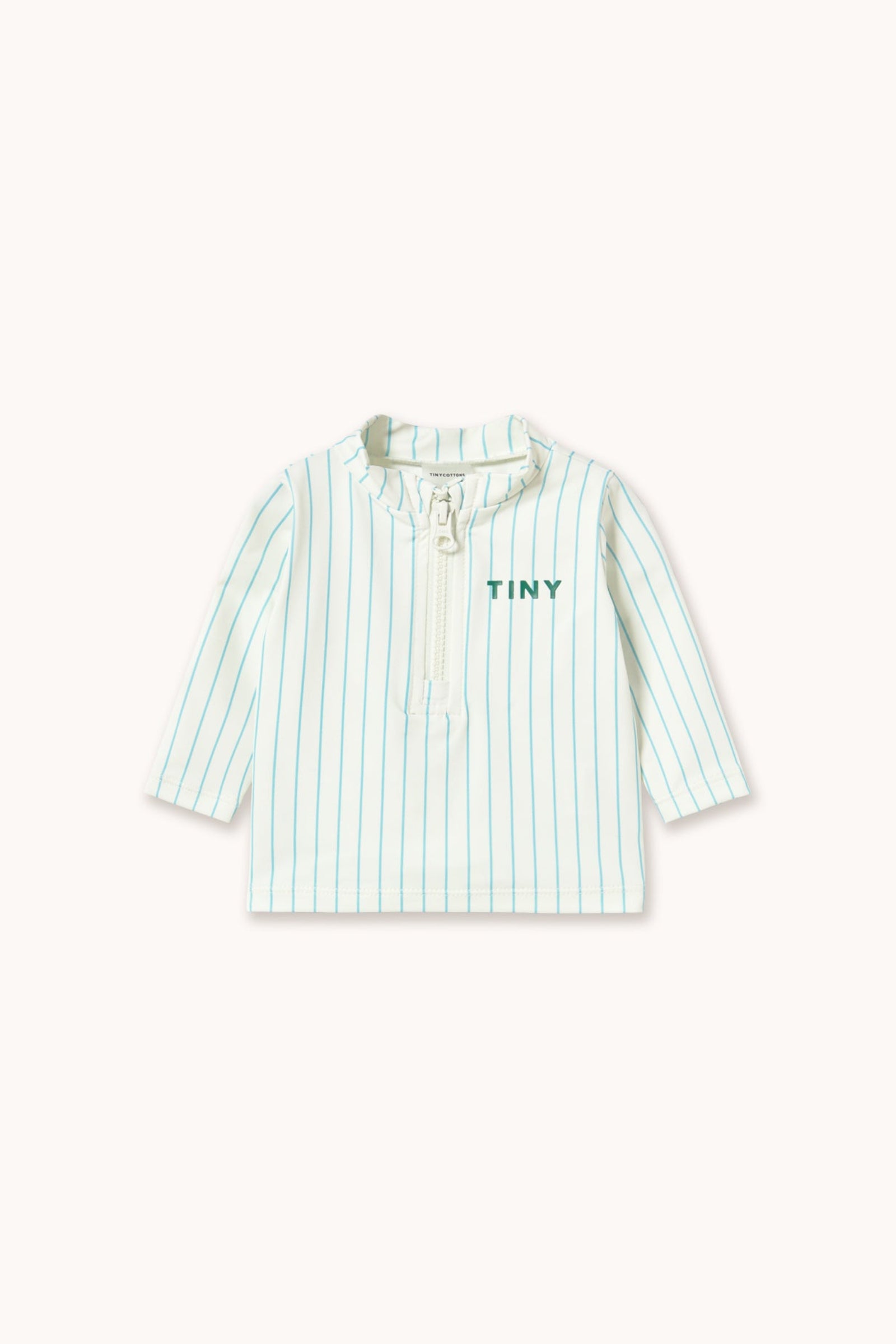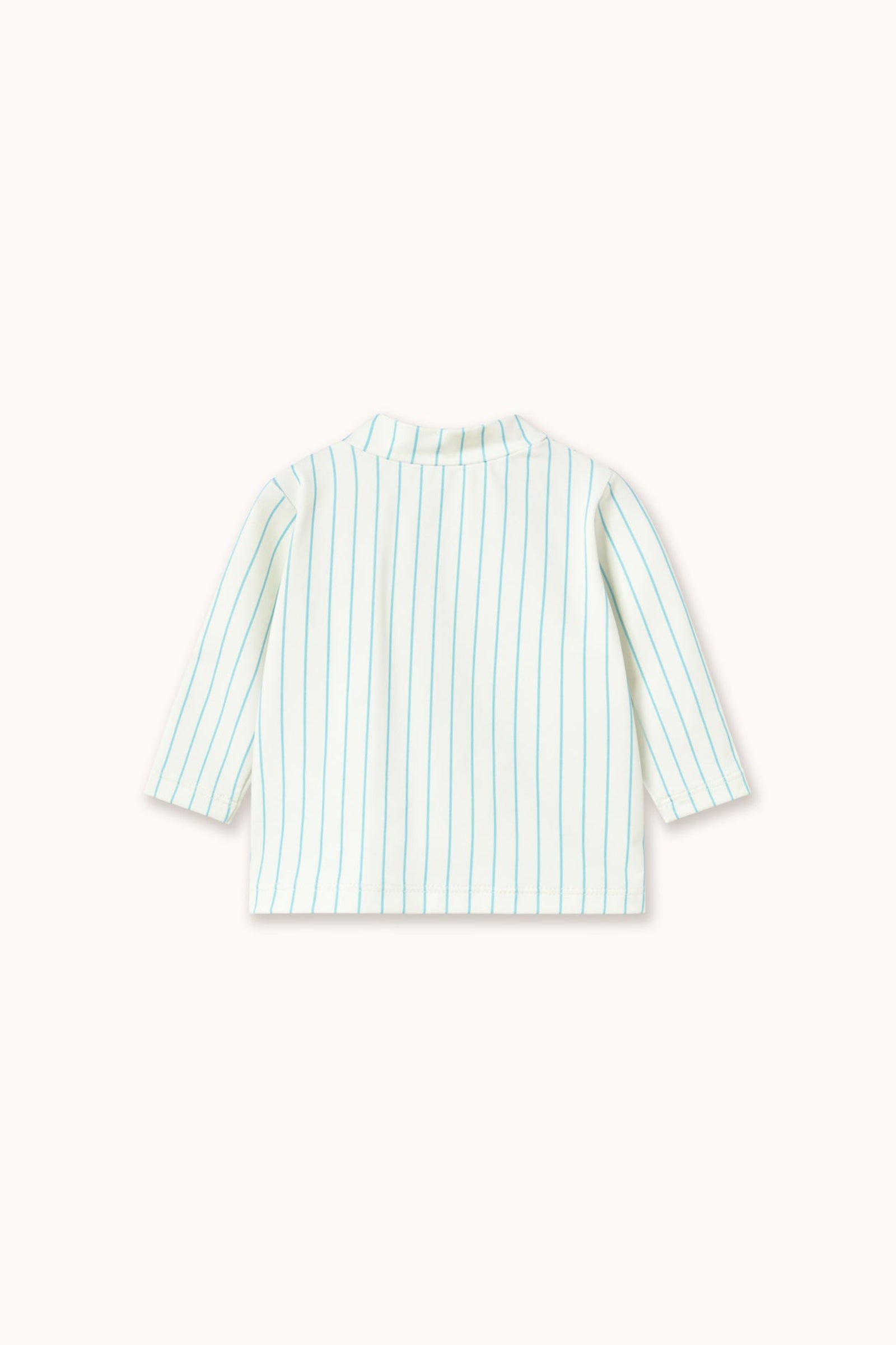 This baby long-sleeve swim shirt with a fine cyan stripe print on an off-white base combines protection, comfort, and style. Made from a stretchy, quick-drying fabric, it allows full freedom of movement in the water. The front zipper makes dressing and changing easy, making it a practical and cute piece for sunny days and water fun.