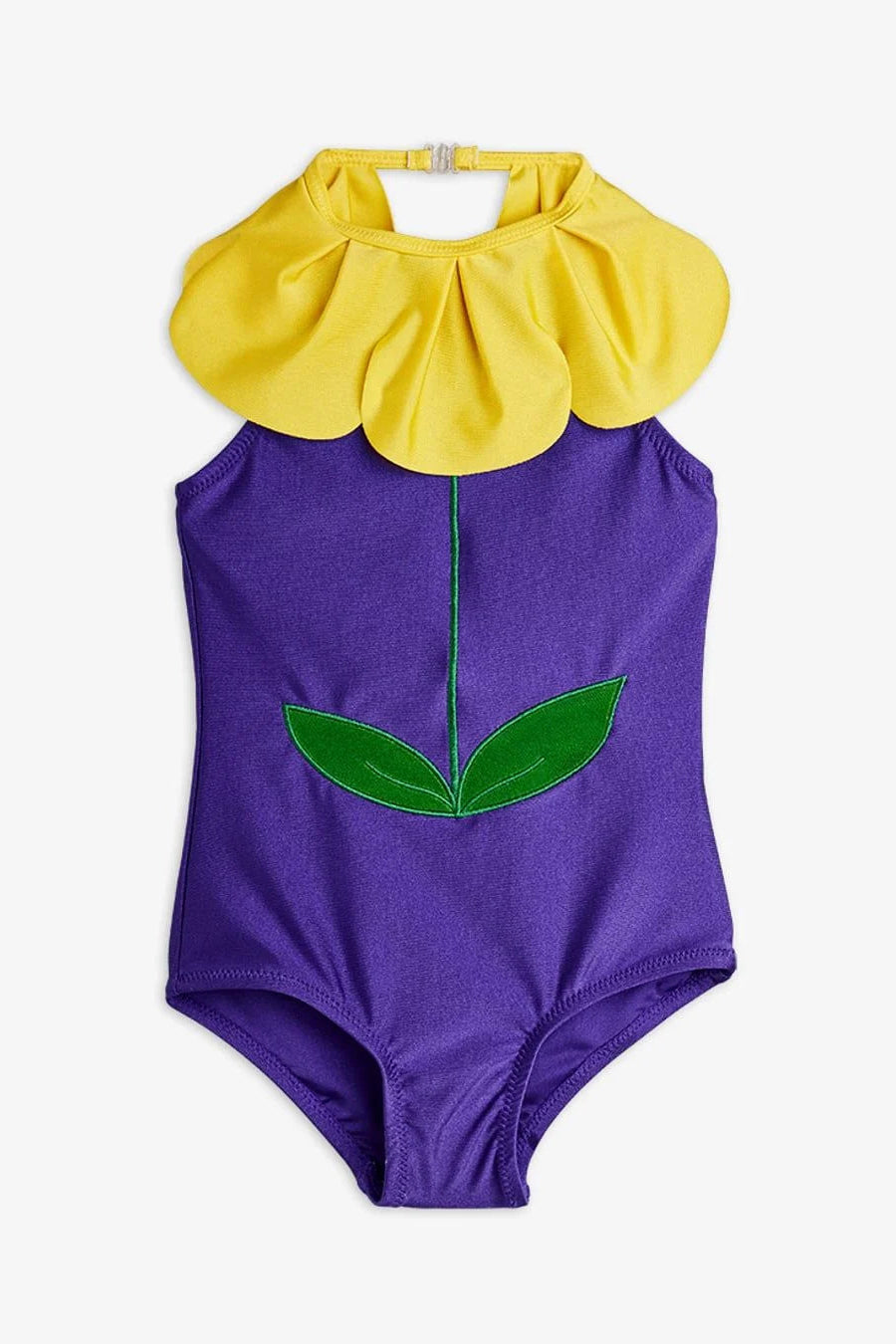 Swimsuit made from 83% recycled nylon and 17% elastane. Halterneck with a voluminous petal ruffle collar, back clasp closure, and a flower stem and leaves appliqué at the front.
