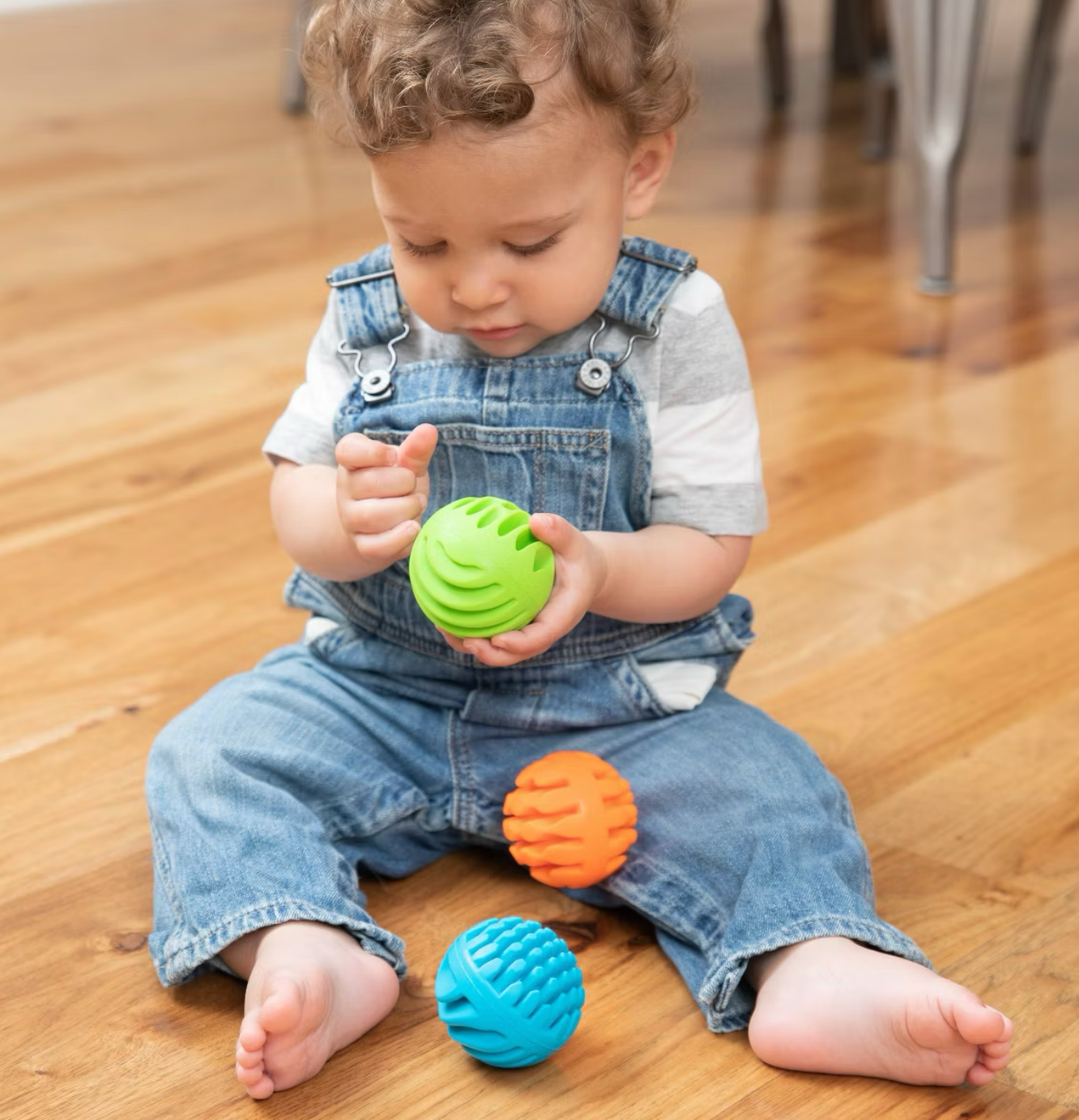 - Set of 3 uniquely textured silicone spheres with beautiful chimes hidden inside