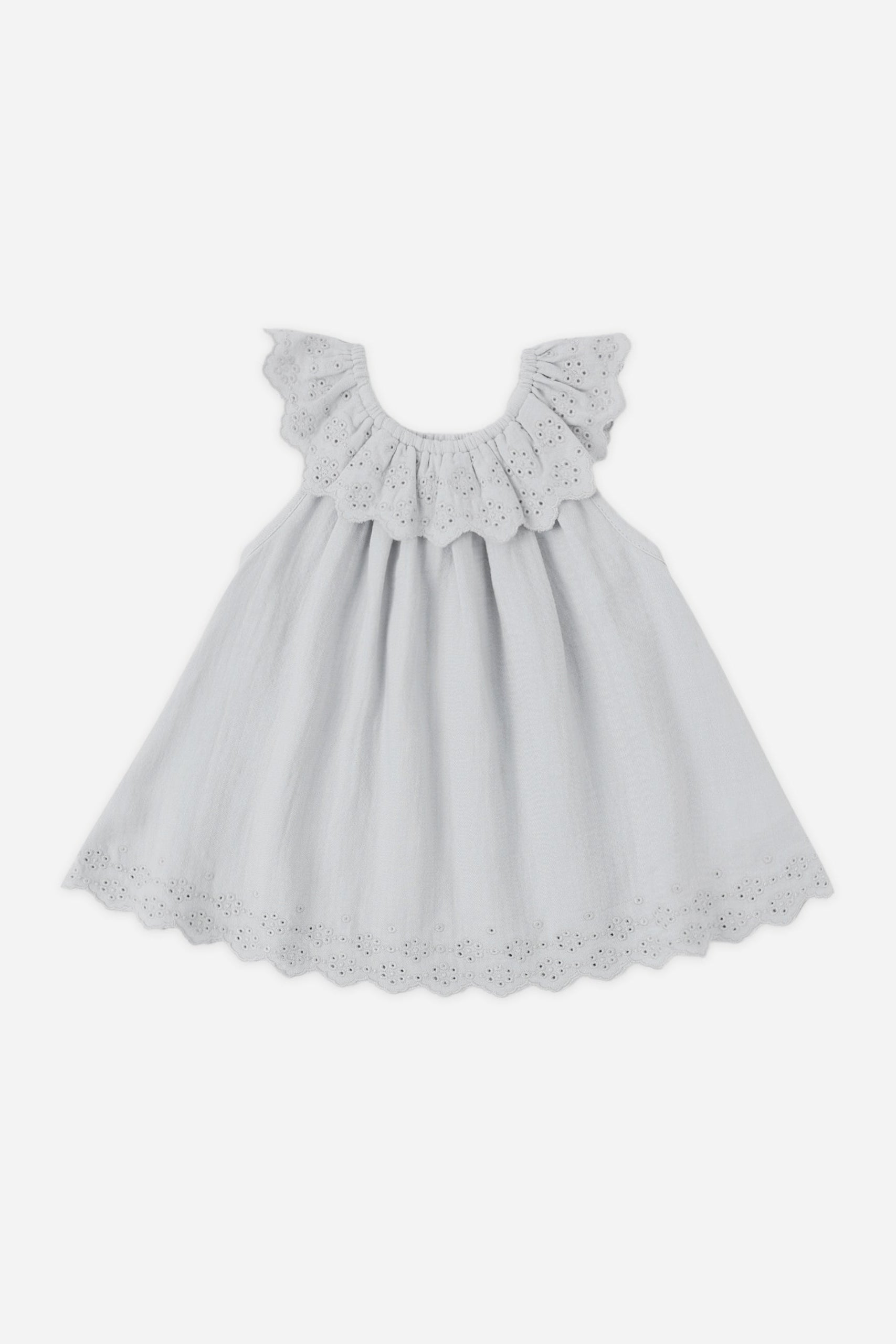 The Isla Dress features a darling embroidered scalloped collar and skirt hem.
