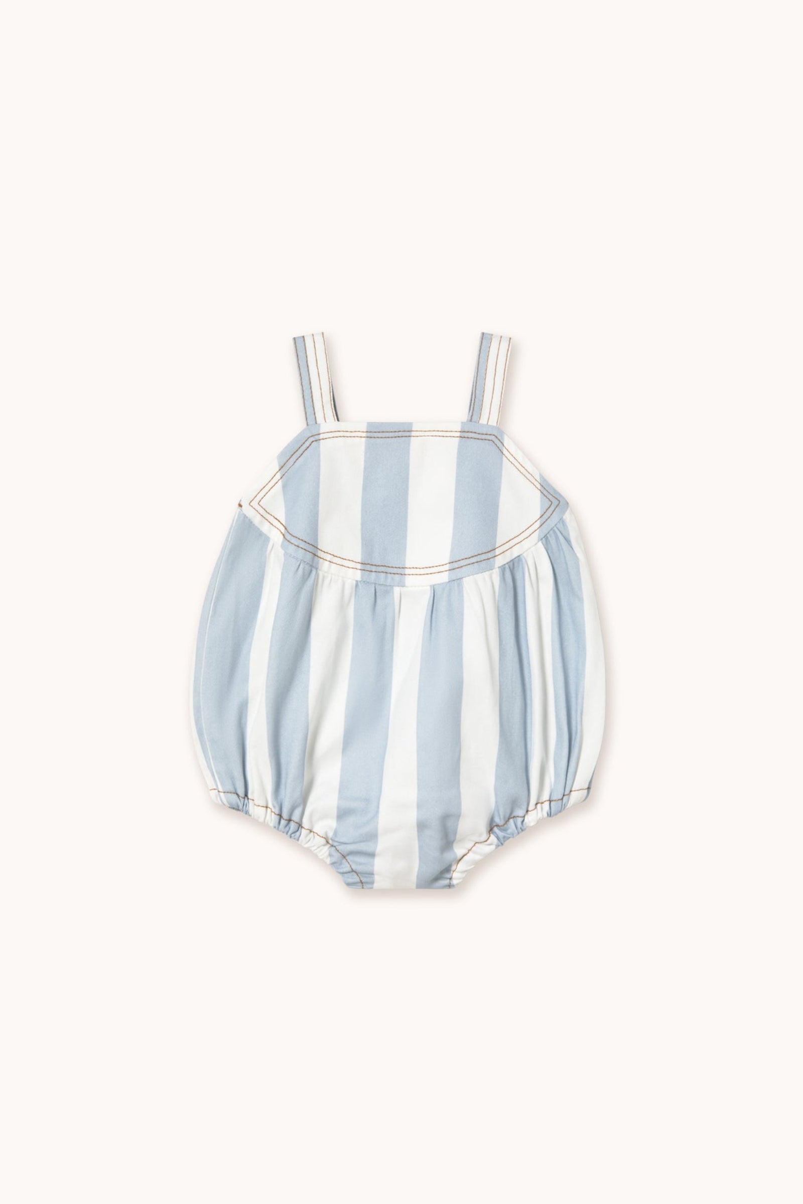 This baby bodysuit with a balloon silhouette in soft light twill fabric with an off-white base features blue stripes. With shoulder straps and a convenient snap button closure, it’s easy to put on, while the bottom snap opening makes diaper changes quick and simple. A sweet and practical design, perfect for the first days of summer.