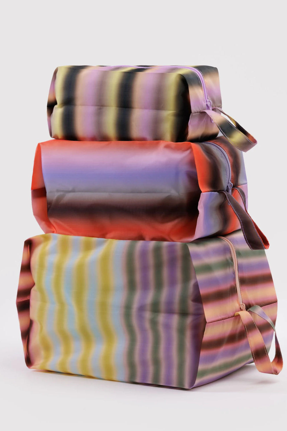 We absolutely love these zipper pouches for all your organizing needs. I have used these A LOT on my travels (and at home) and love them. On my recent trip home (to London) I used these for the kids toys, a spare set of clothes for all of us (quick PJ change!), and then some diapers and wipes. Now back in Portland - I use the largest one for my workout clothes and sneakers - a quick grab and go moment.  These come as a set of three and have loops for carrying and hanging on the go. These are all machine washable (cold wash only and line dry).