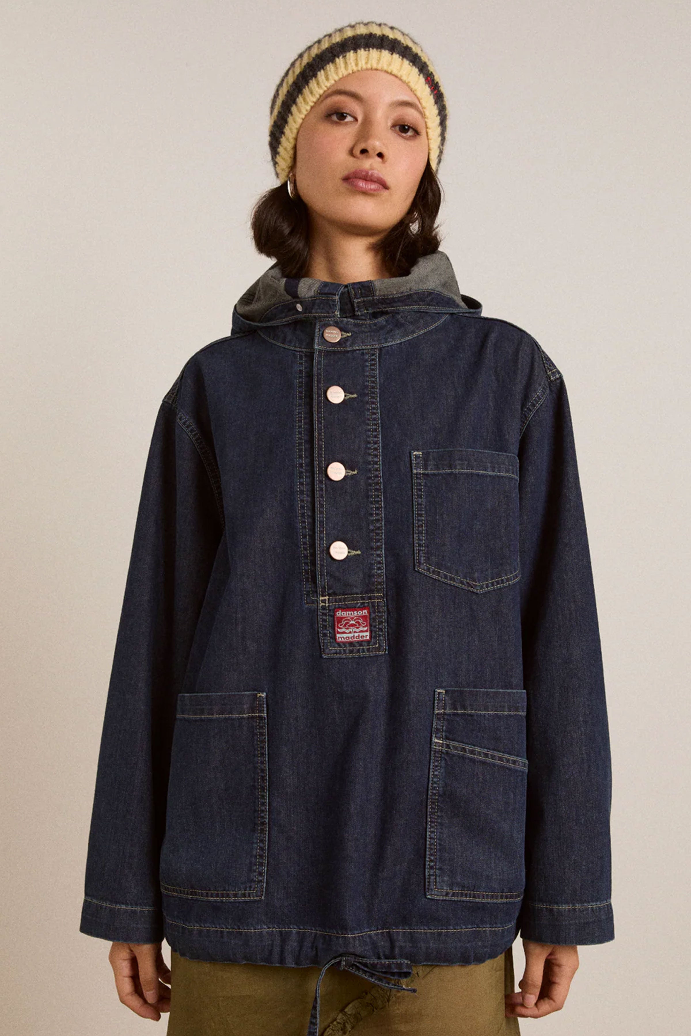 Effortlessly laid back with elevated detailing, this oversized smock-style hoodie is crafted from soft, fluid denim made from 100% organic cotton. Designed with a relaxed silhouette, it features a front shank fastening, contrast stitching, and adjustable cuffs for a custom feel. Functional touches include a front pocket, drawstring hem, and a signature DM branded patch.