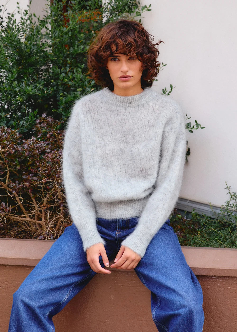 The Jane mohair sweater is cut fairly short. It is designed to fall delicately on your hips. The volume of the body and the high ribbing give it a slight blousant effect.