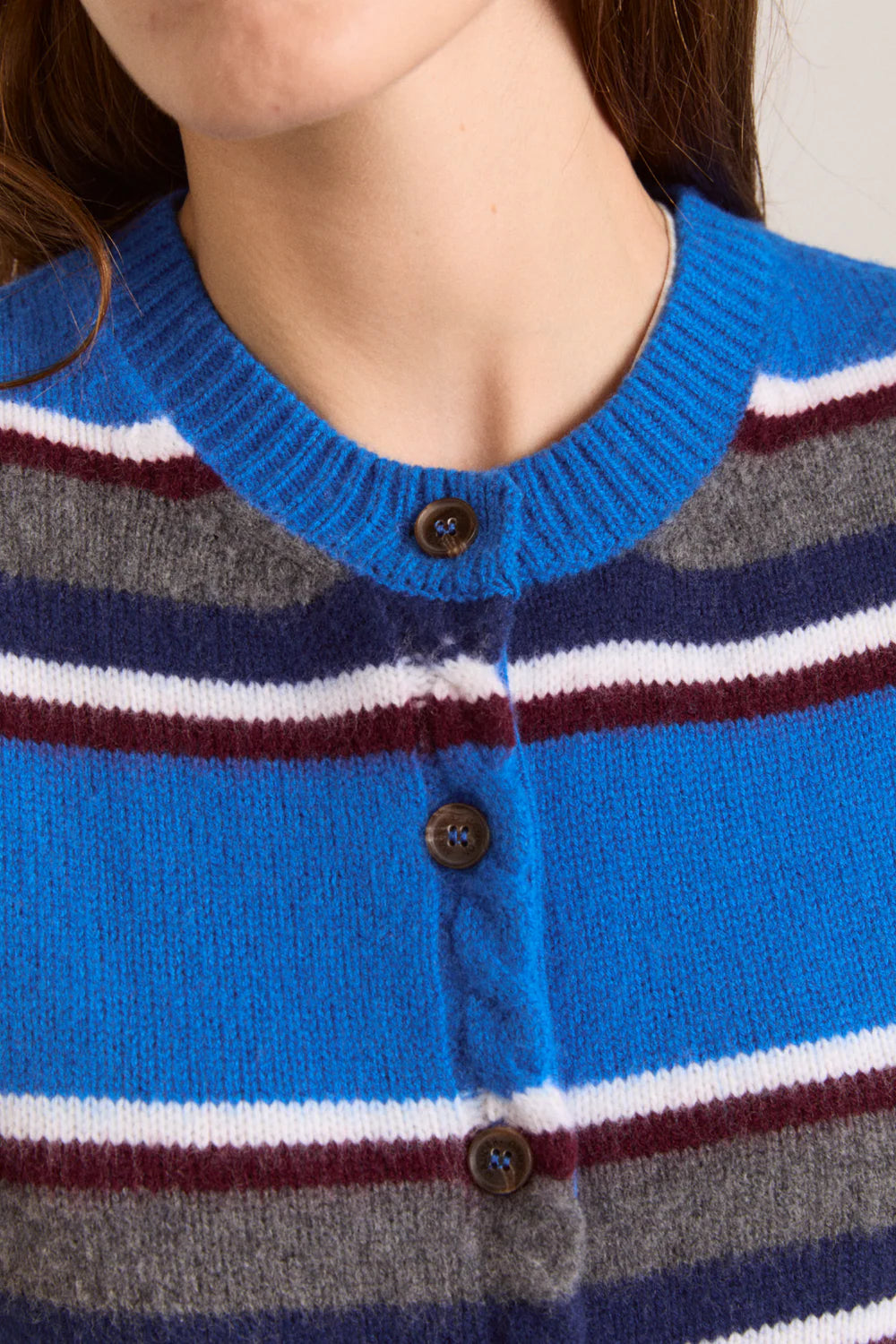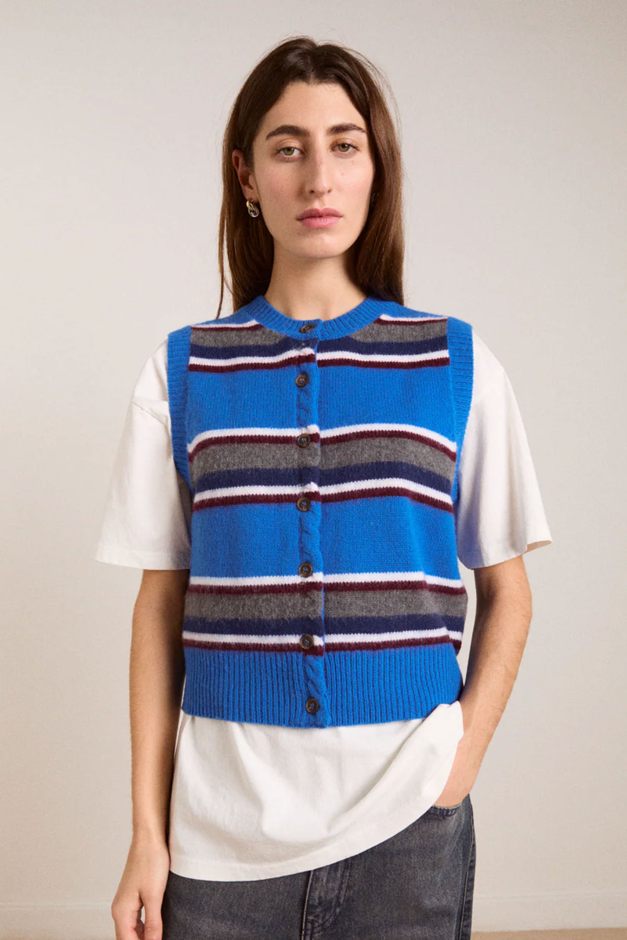 The Sofie Merino Wool Vest brings an elevated ease to everyday layering. Crafted from 100% RWS Merino Wool, it features an all-over stripe design with a relaxed, throw-on silhouette. A cable-knit button placket and branded buttons add subtle texture and detail, making it an effortless staple for transitional dressing.