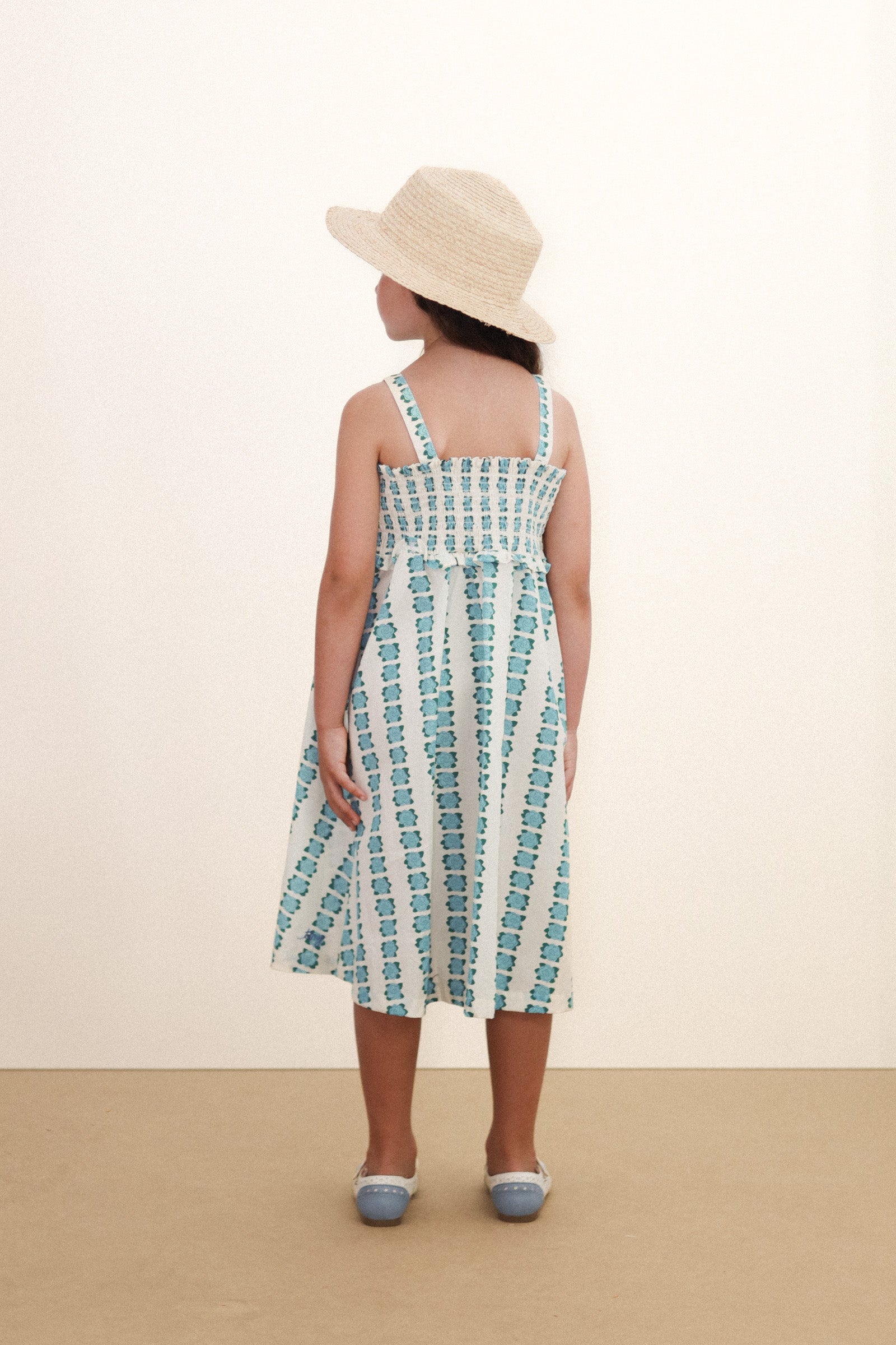 This short dress with a Blue Flowers print on an off-white base combines sweetness and comfort in an adorable, versatile design. Featuring straps made from the same fabric and smocking at the chest, it provides a comfortable fit and a delicate, feminine look. Perfect for sunny days and charming casual occasions.