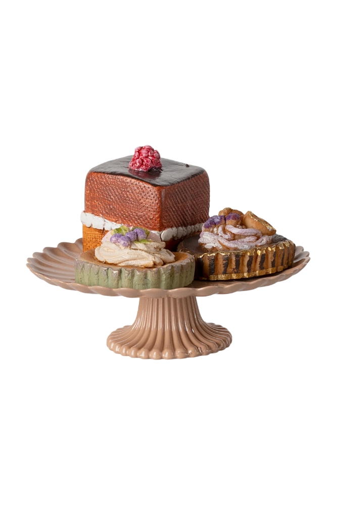 This little set of 3 delicious cakes on a beautiful decorated cakestand in rose color is a must have. The cakes are thoroughly decorated by hand. The cake set is made in size mini for Teddy family and Bunny & Rabbit size 1 & 2.