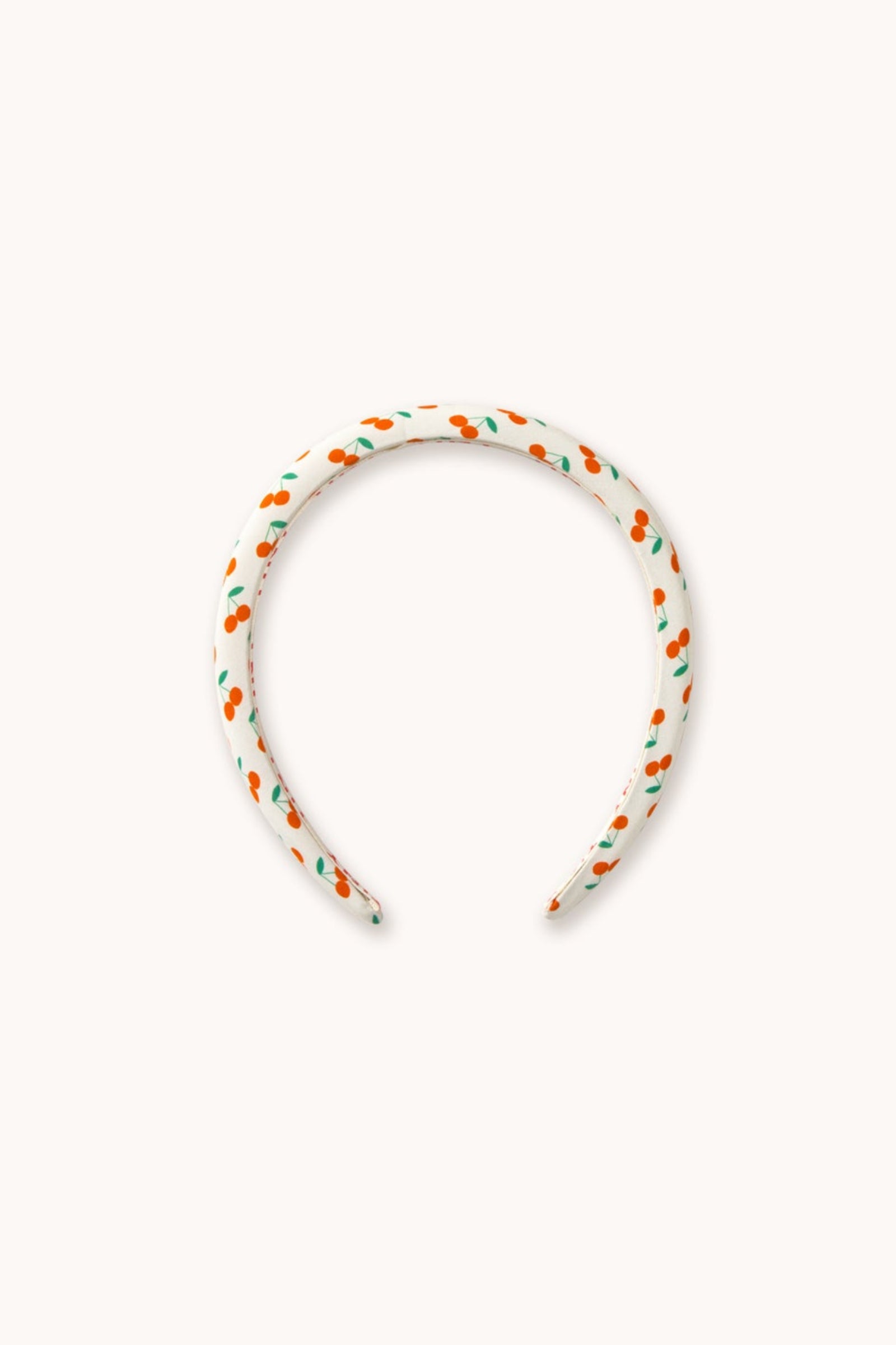 This padded poplin headband featuring the Cherries print on an off-white base adds a sweet and sophisticated touch to any look. Its cushioned design provides a comfortable, stylish shape, perfect for adding a special finishing touch to everyday outfits. Made with 100% cotton.