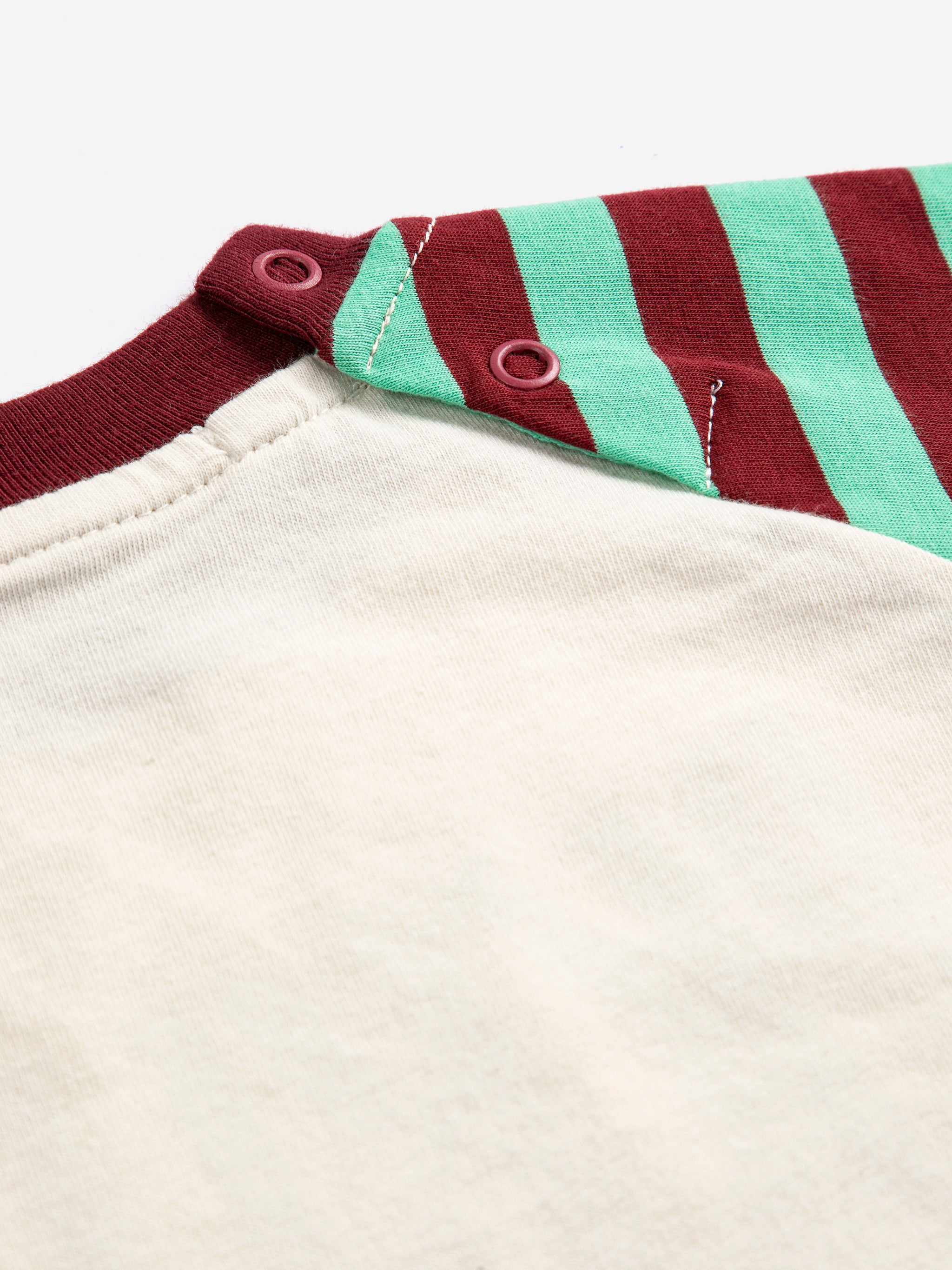 Designed with raglan sleeves, shoulder snap fastening, loose fit, and round neck.